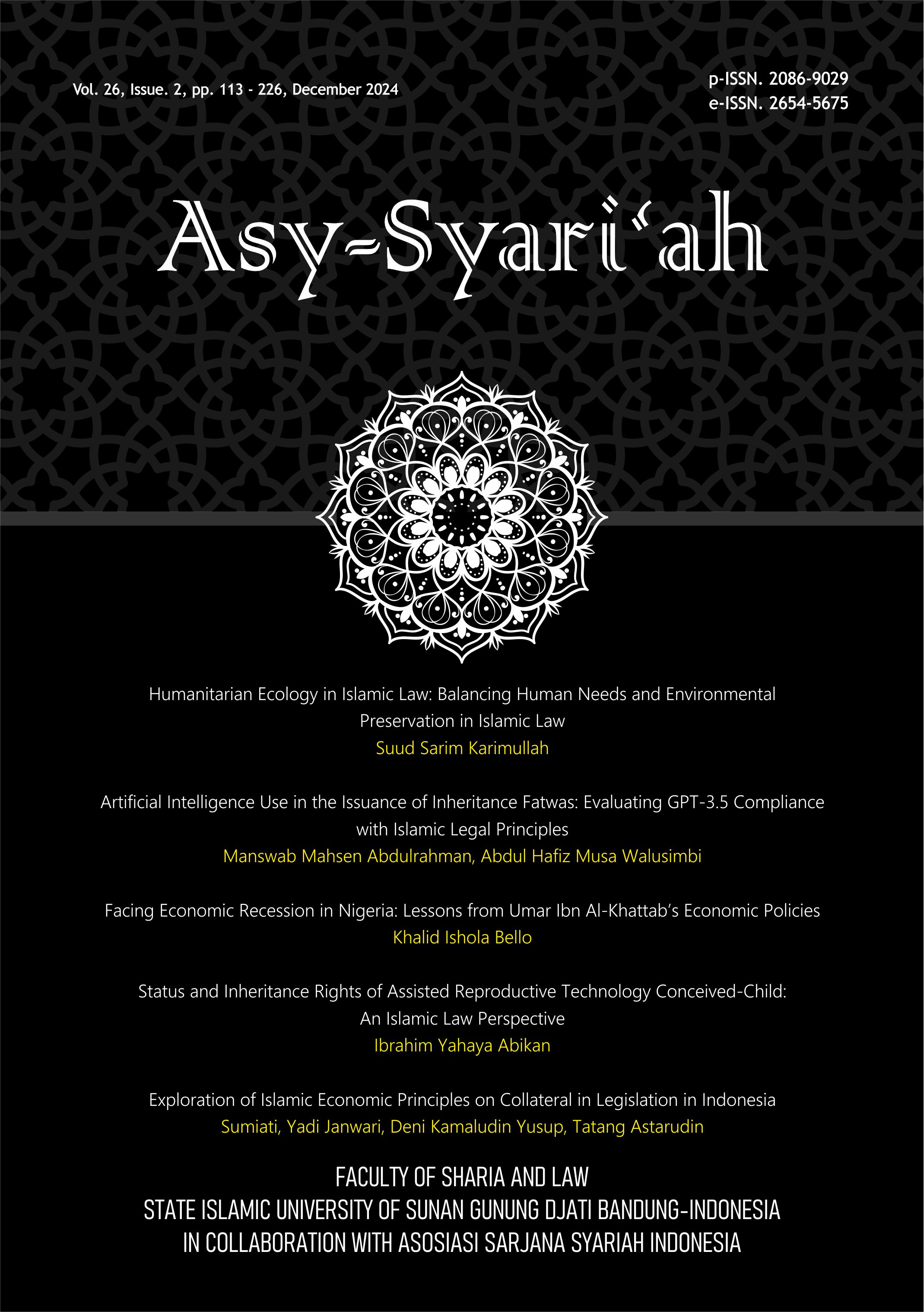 Editor in Chief: Prof. Dr. H. Ah. Fathonih, M.Ag.This issue (Asy-Syari'ah Volume 26 Issue 2 of 2024) has been available online since 31st December 2024, for the regular issue of December 2024. All articles in this issue consist of 5 original research articles that were authored/co-authored by 9 authors from 4 countries (Indonesia, Nigeria, Turkey, and Uganda)