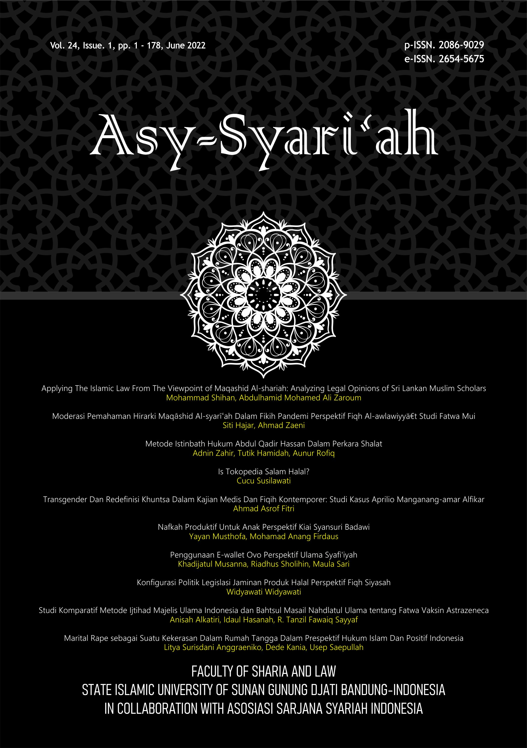Editor in Chief: Prof. Dr. H. Ah. Fathonih, M.Ag.This issue (Asy-Syari'ah Volume 24 Issue 1 of 2022) has been available online since 30 June 2022, for the regular issue of June 2022. All articles in this issue consist of 10 original research articles that were authored/co-authored by 22 authors from 2 countries (Indonesia and Malaysia)