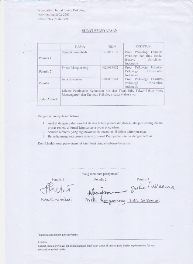 2. The formal legal provisions for access to digital articles of this electronic journal are subject to the terms of the Creative Commons Attribution-ShareAlike license (CC BY-SA), which means that the Journal of Psychology reserves the right to save, transmit media / format, manage in database form, , maintain, and publish articles without requesting permission from the Author as long as it continues to include the name of the Author as the owner of Copyright.